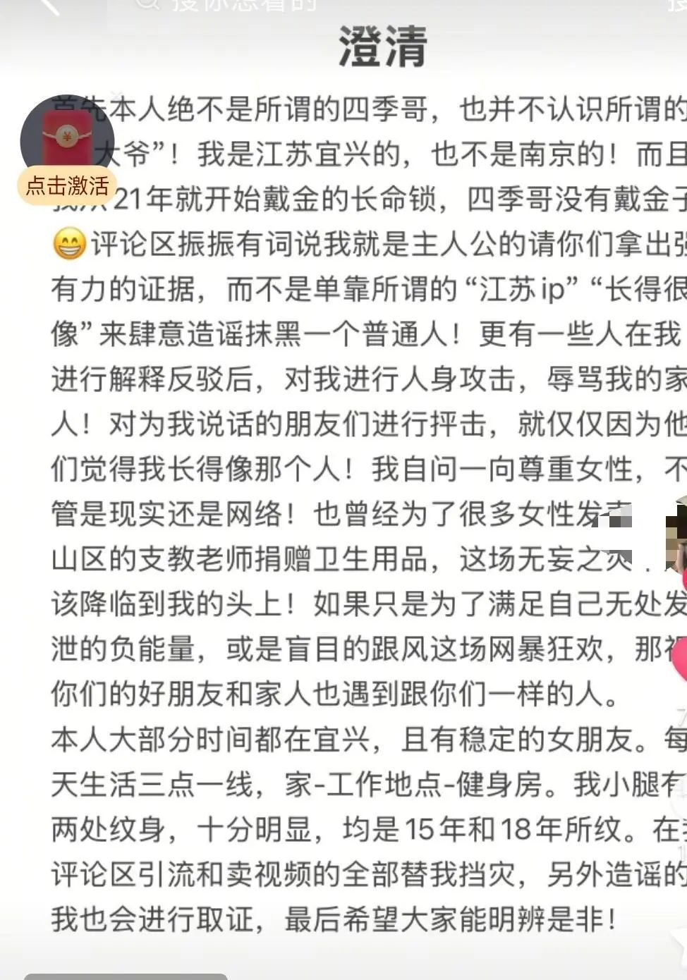 “本人绝不是所谓的四季哥,也不认识所谓的红老头!”7月8日,江苏宜兴一男子发布澄清声明称,他因为江苏IP、长得很像“南京红老头”事件当事人,被网友造谣抹黑,在解释反驳后,反而被人身攻击辱骂家人。他称“本人大部分时间都在宜兴,且有稳定的女朋友,每天生活三点一线,造谣的我会进行取证,最后希望大家能明辨是非!”极目新闻记者尝试私信男子,发现他已禁止评论和私信。