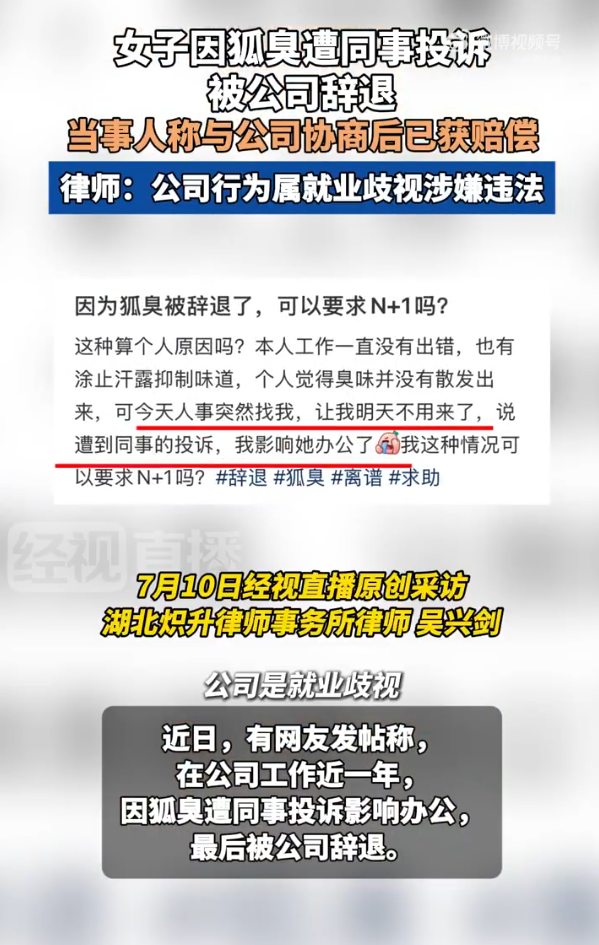 近日,一则“因狐臭被公司辞退”的网友求助帖引发热议。发帖网友称,自己在公司工作近一年,虽然日常使用止汗产品,但因同事投诉影响办公,被人事辞退。数日后,该网友更新消息表示已与公司达成和解,获得半个月工资及一个月社保补偿,并计划进行手术治疗。