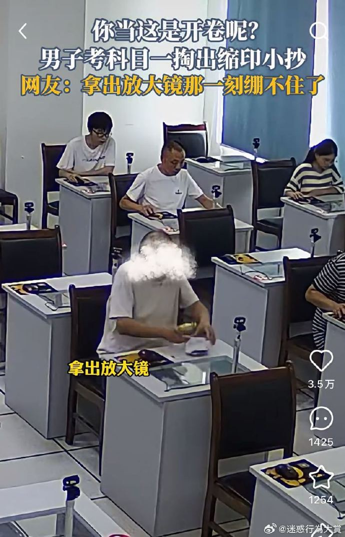7月3日上午,四川盐亭车管所科目一考场内,一名考生拿出自己准备的“小抄”和放大镜作弊,被考官抓了个正着。