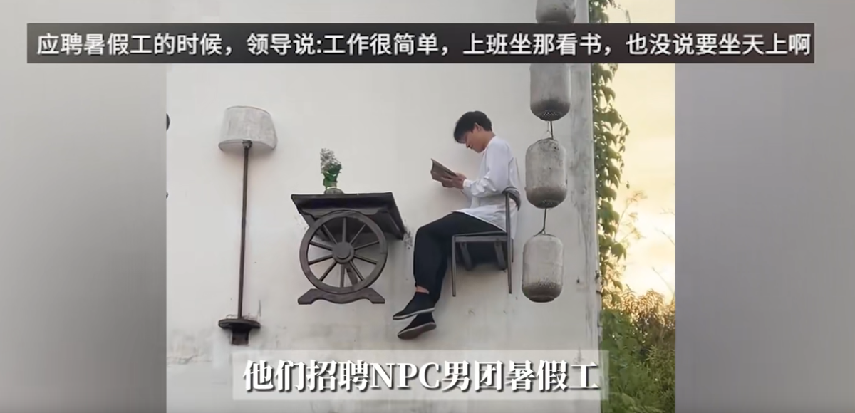 近日,江西一景区NPC暑假工走红,男生应聘暑假工,内容是做看书模特坐墙上“看书”,每次仅需坐10分钟,月薪就万了。