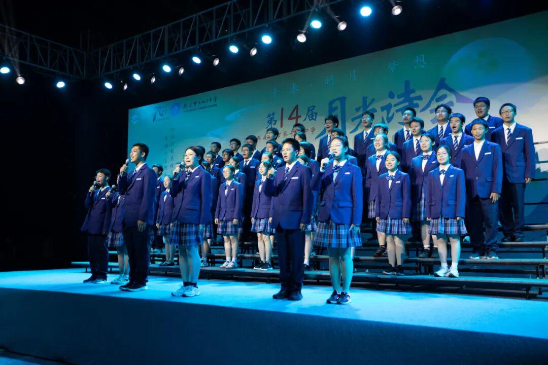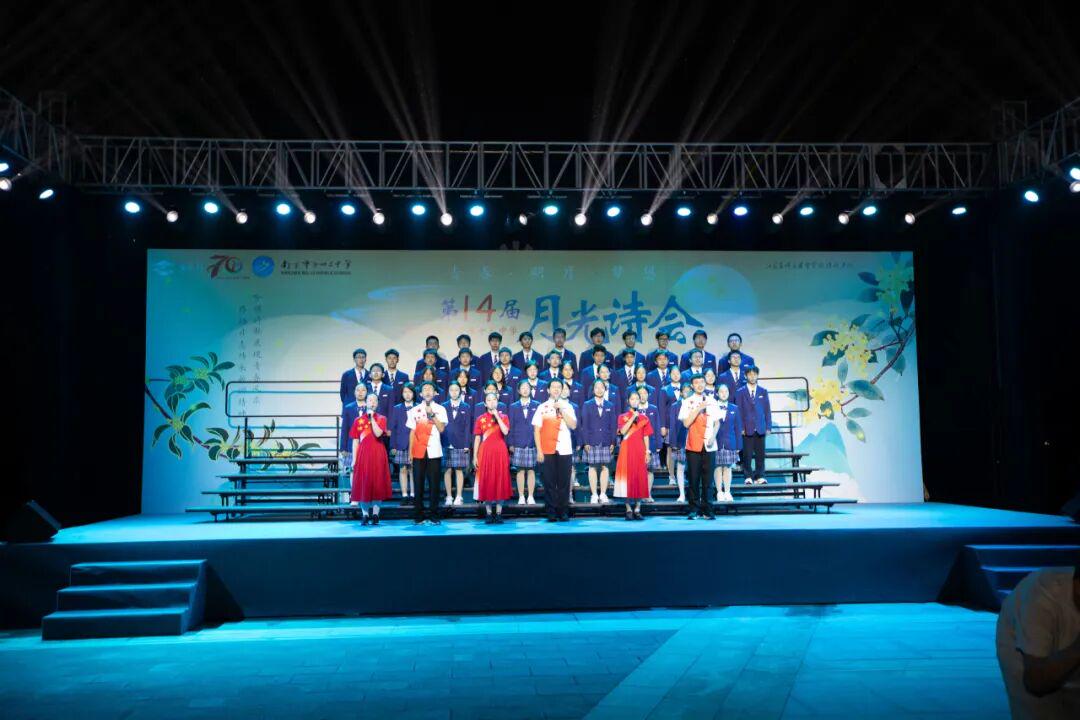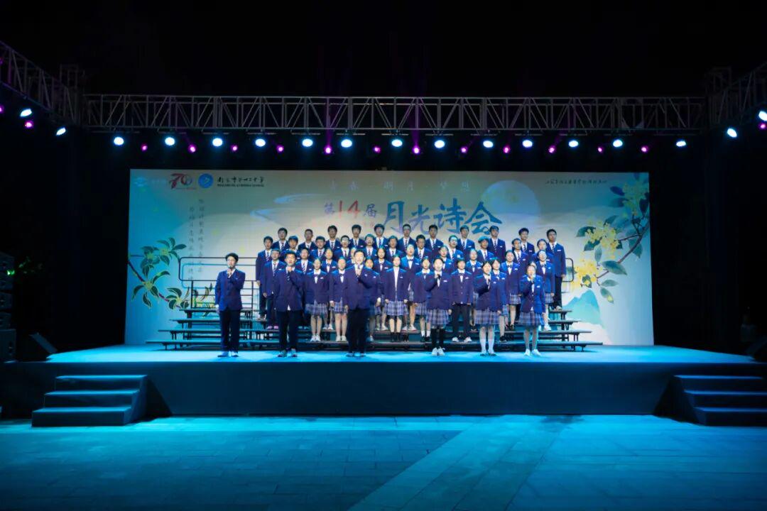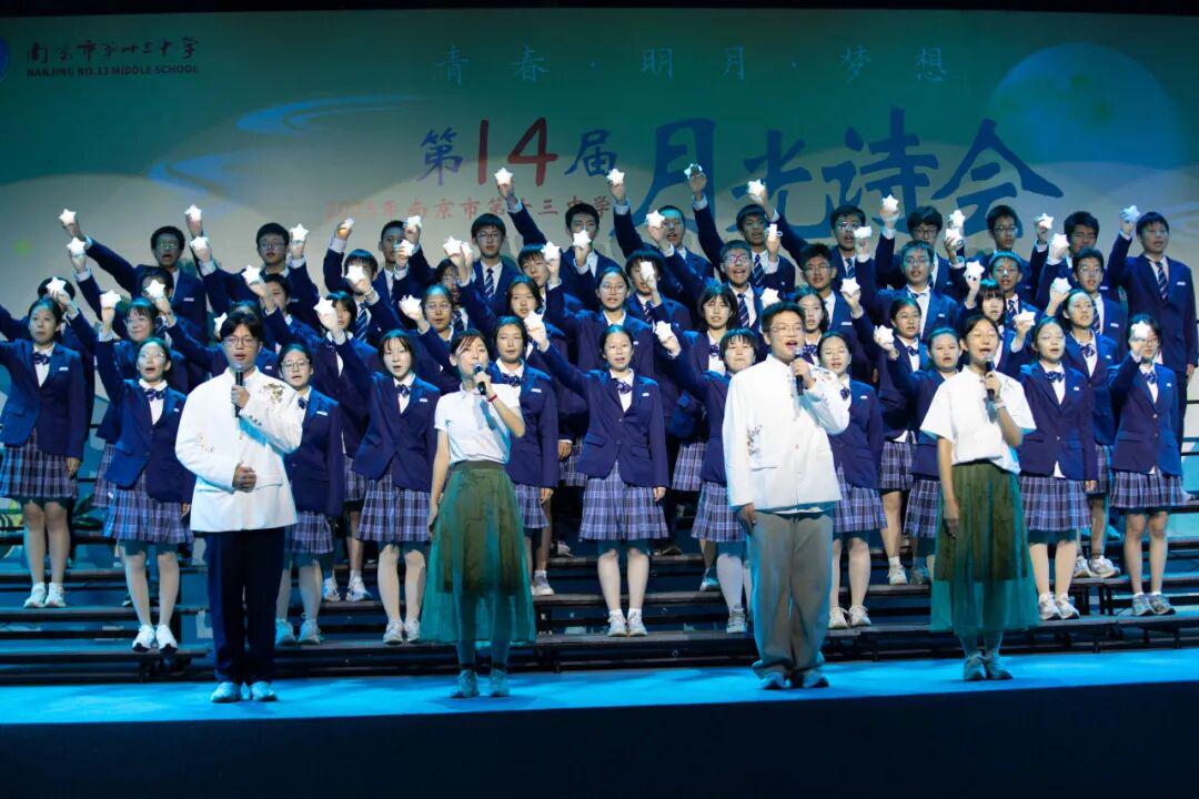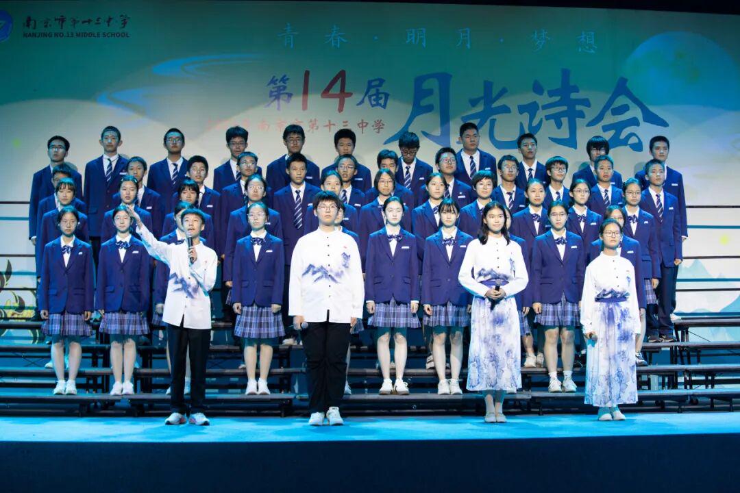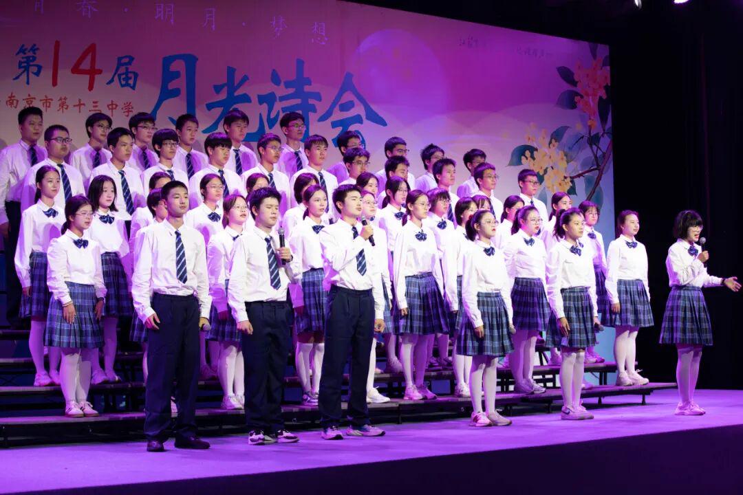 琅琅诗声,盈盈笑语,唤醒了沉睡的星河。诗会在《十三中赋》“石城虎踞,钟山龙蟠”的齐诵声中进入高潮,在“玄武碧波”悠扬的校歌旋律中进入尾声。月下十三中师生,在这平仄中感受这座书香校园深厚的文化力量,在这旋律中感受七十载历史长河积淀的文化底蕴,更在这梦想启航的结语声中感受青春特有的激情和活力。