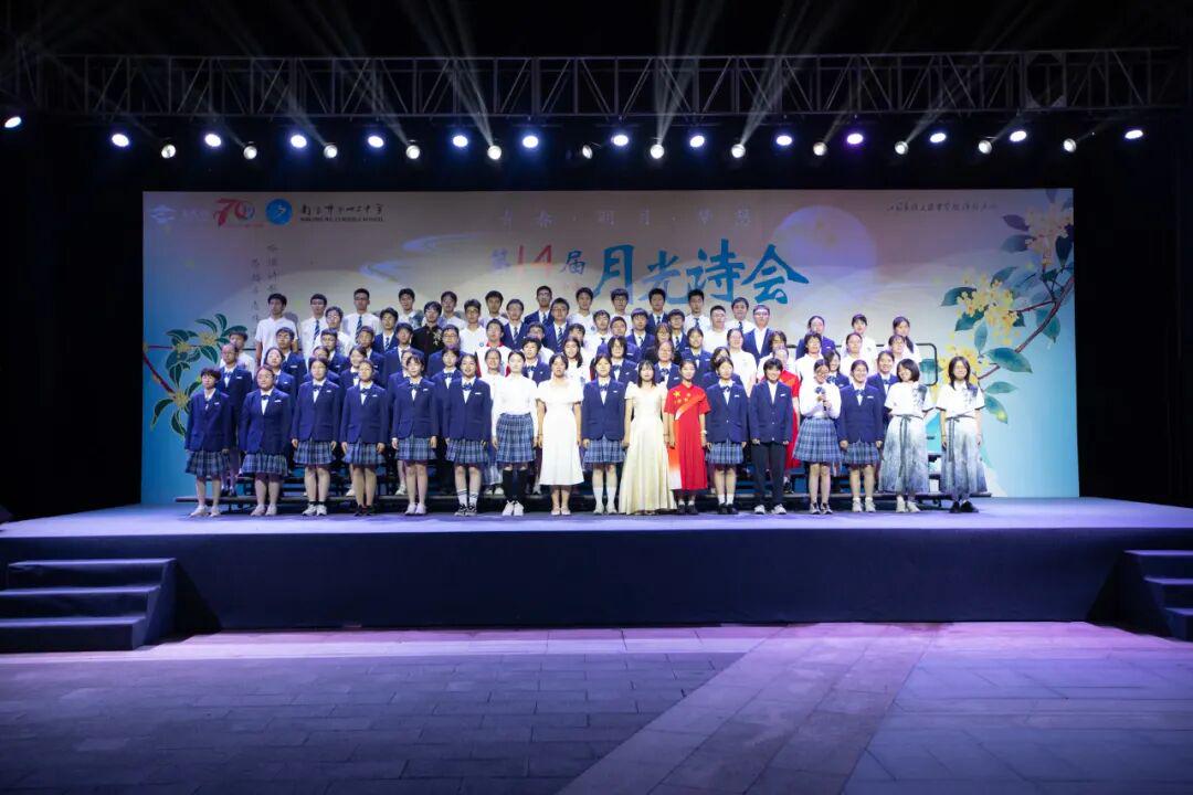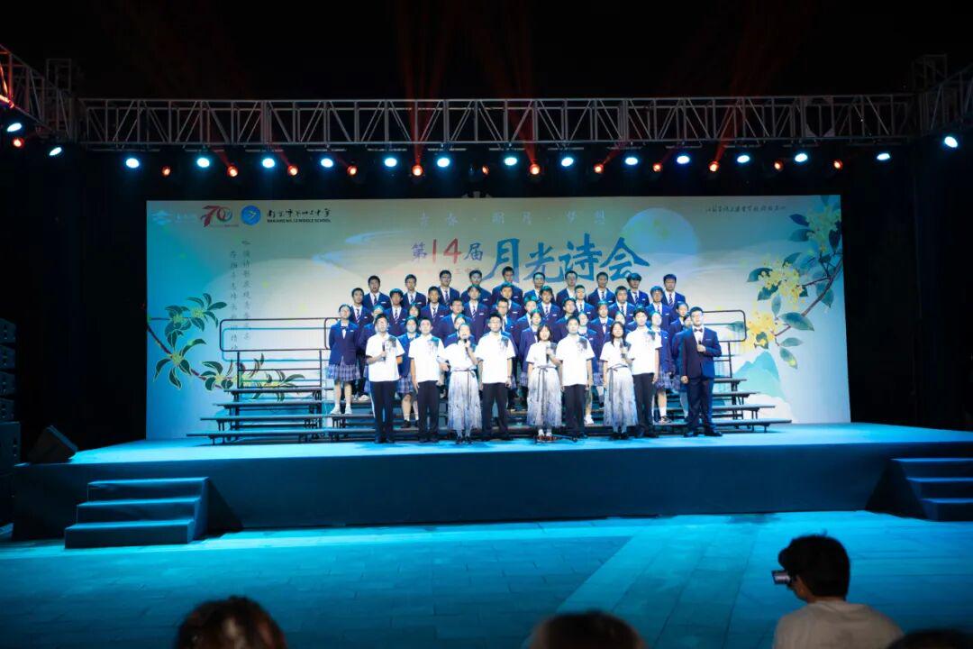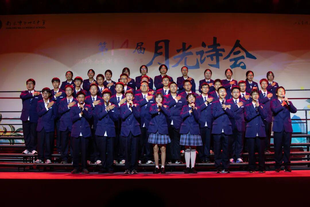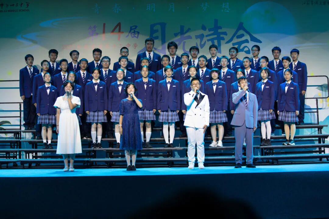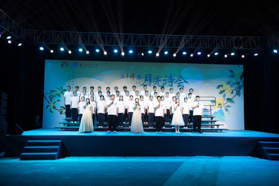琅琅诗声,盈盈笑语,唤醒了沉睡的星河。诗会在《十三中赋》“石城虎踞,钟山龙蟠”的齐诵声中进入高潮,在“玄武碧波”悠扬的校歌旋律中进入尾声。月下十三中师生,在这平仄中感受这座书香校园深厚的文化力量,在这旋律中感受七十载历史长河积淀的文化底蕴,更在这梦想启航的结语声中感受青春特有的激情和活力。