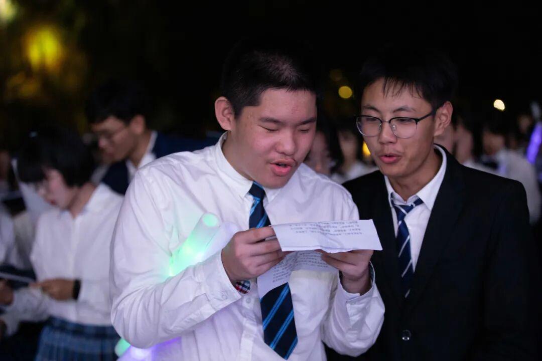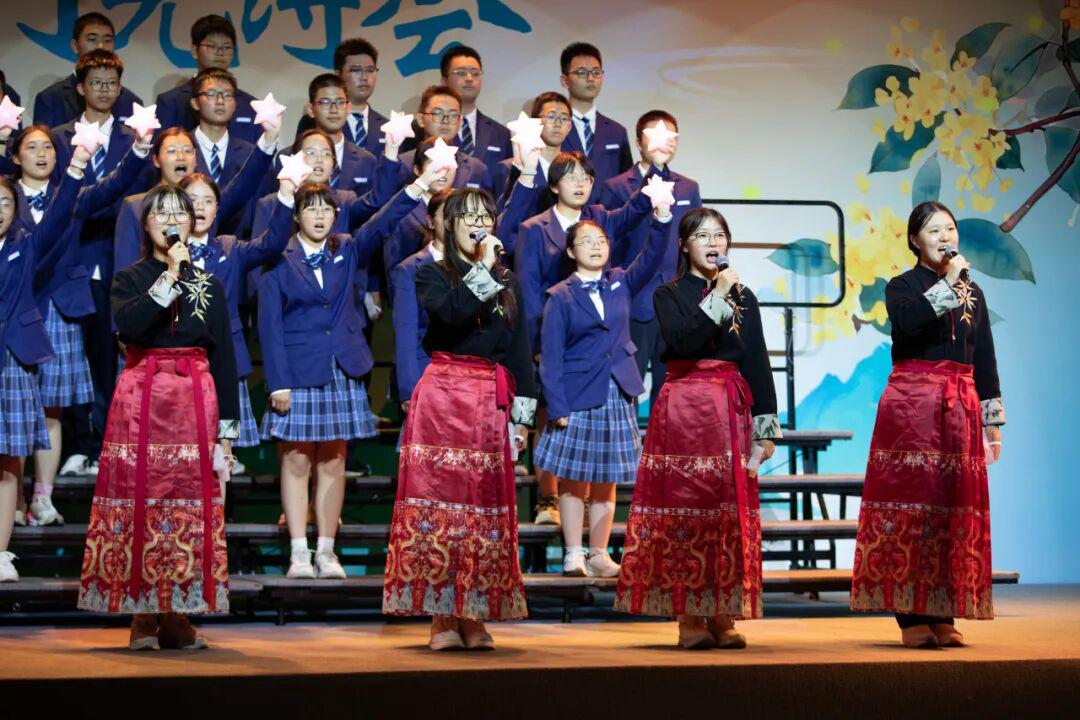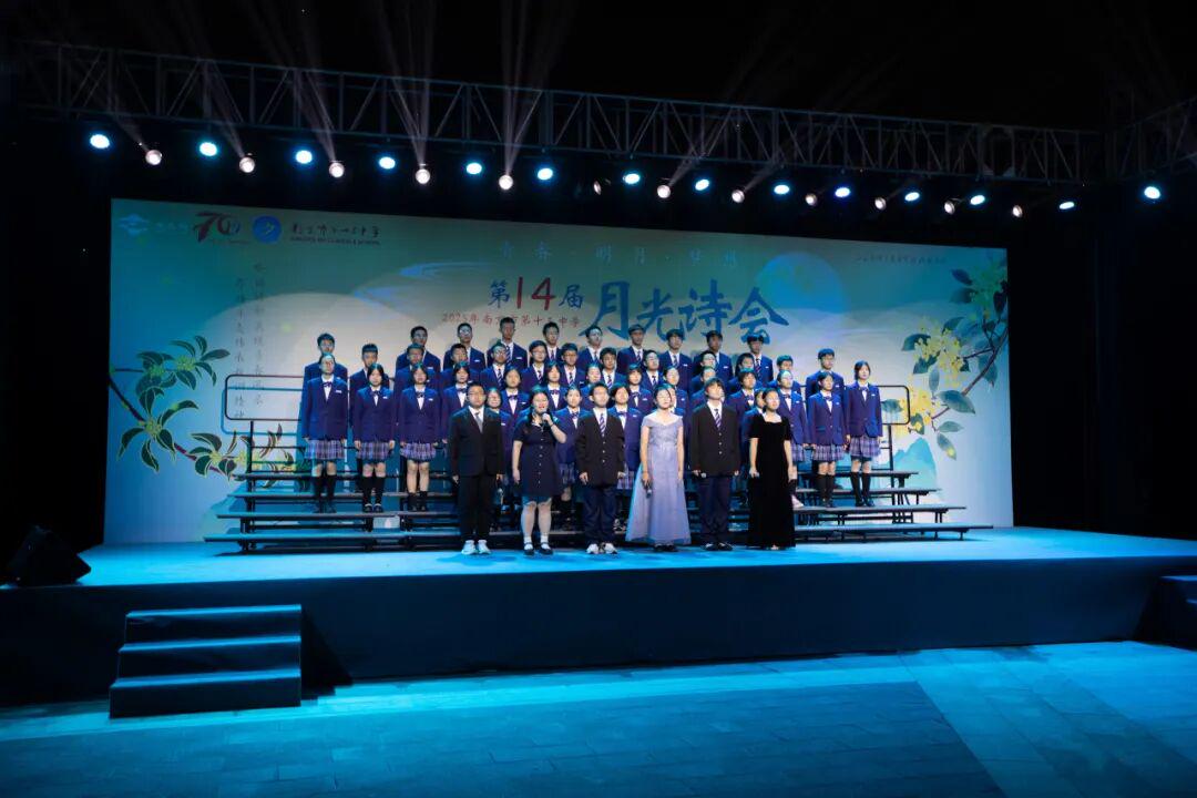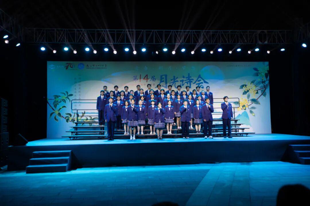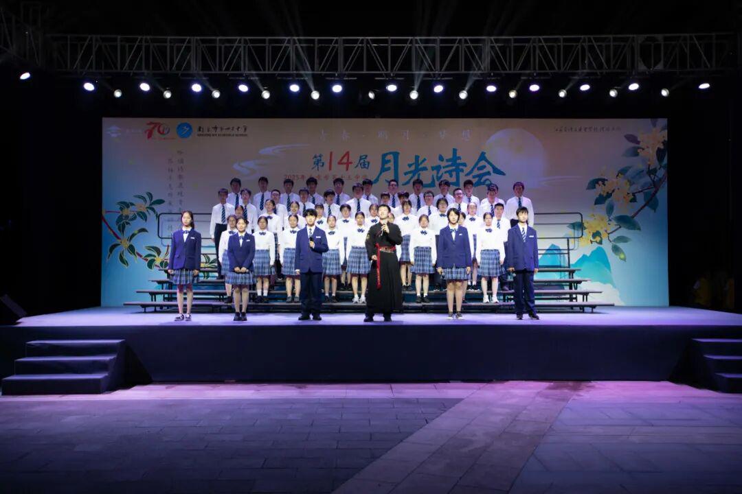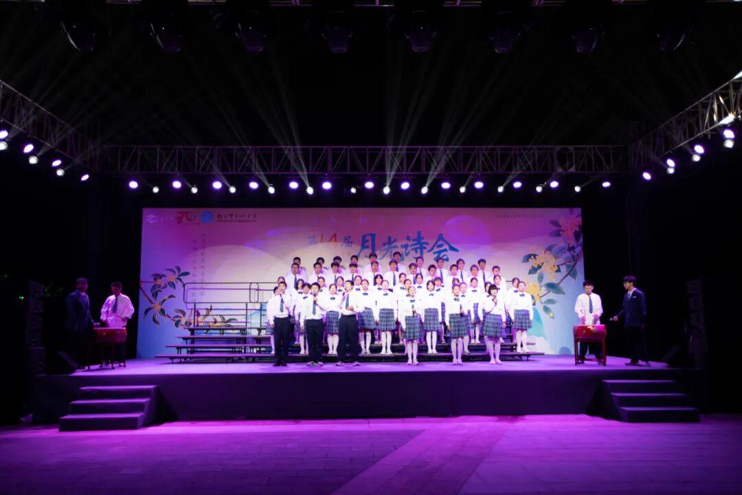 琅琅诗声,盈盈笑语,唤醒了沉睡的星河。诗会在《十三中赋》“石城虎踞,钟山龙蟠”的齐诵声中进入高潮,在“玄武碧波”悠扬的校歌旋律中进入尾声。月下十三中师生,在这平仄中感受这座书香校园深厚的文化力量,在这旋律中感受七十载历史长河积淀的文化底蕴,更在这梦想启航的结语声中感受青春特有的激情和活力。