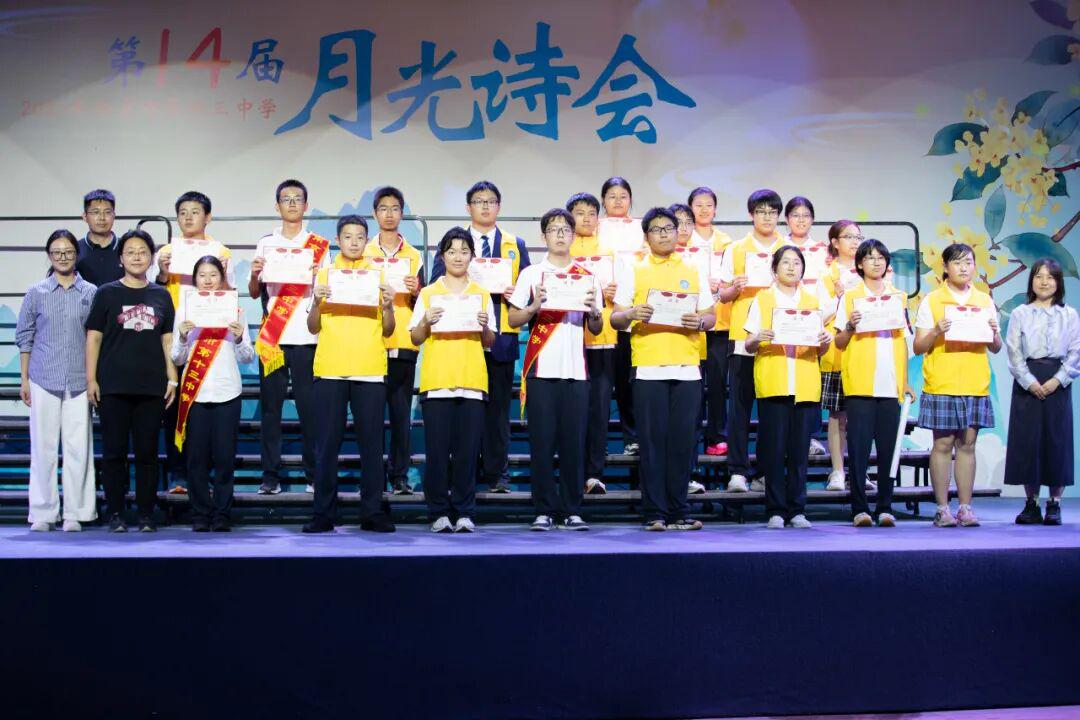 本次诗会设有“才高八斗”“匠心独具”“妙笔生花”“神采奕奕”“声入人心”“金声玉振”六个奖项。校级领导、特殊嘉宾、高一年级主任、班主任代表和语文组老师分别为获奖班级颁发了奖状。此外,由两校区十九位“黄马甲”志愿者组成的“护月”小分队也受到了一份特别的纪念奖状。明明如月,何不能掇?他们维持秩序、保养设备,虽不能站上舞台朗诵,却也值得拥有一份掌声。