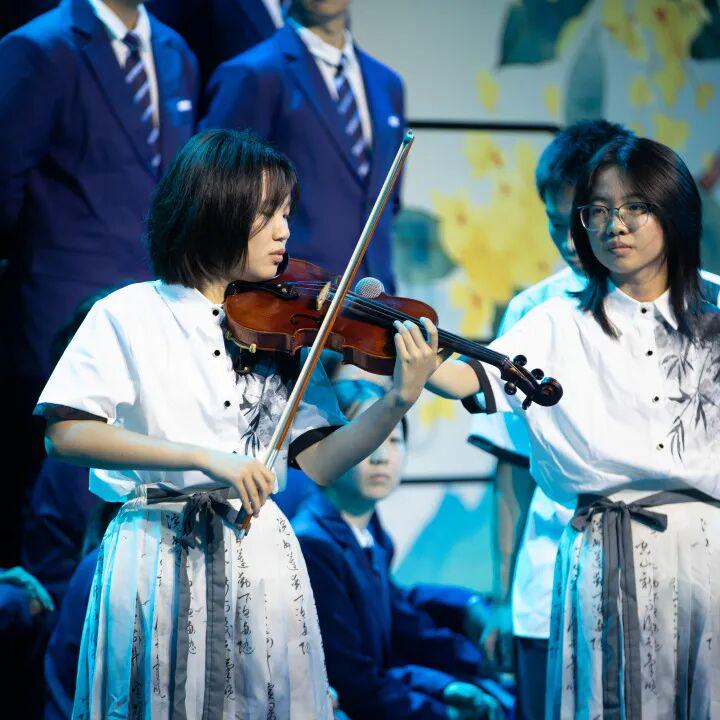 二十个班级,二十场视听盛宴,不仅有大鼓铿锵有力的节奏衬托出青年心中的热血,将《凤凰涅槃》的朗诵推向磅礴的高潮,还有小提琴悠扬深情的旋律,为《月光下的少年》铺就流动的情感底色;不仅有经典诗词中月照书窗的静谧画面,将夜的温柔细腻传递,还有原创诗句里校园晨昏与琅琅书声,在月光下重温青春的温度。各班级紧扣“月光·青春·梦想”,以多元艺术形式展现了独有的青春气象与理想追求,将咏月、颂青春、逐梦想的主题层层推进,凝聚成一场视听与情感共鸣的青春礼赞。