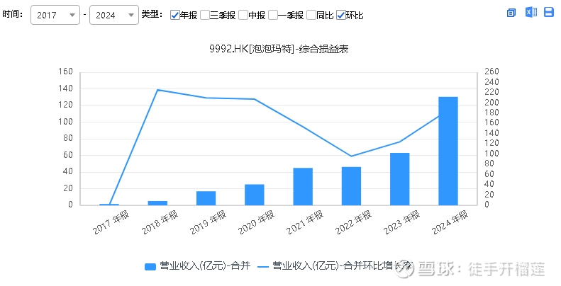 所以泡泡玛特的IP的生命力会比较长,Molly是在2016年上架销售的,在2024年销售额依然增长105%。 回看泡泡的历史,除了疫情三年,其余每年的增长都在100%以上(事实上,2020年、2021年都有50%~60%的增长,只有2022年微弱增长2%)