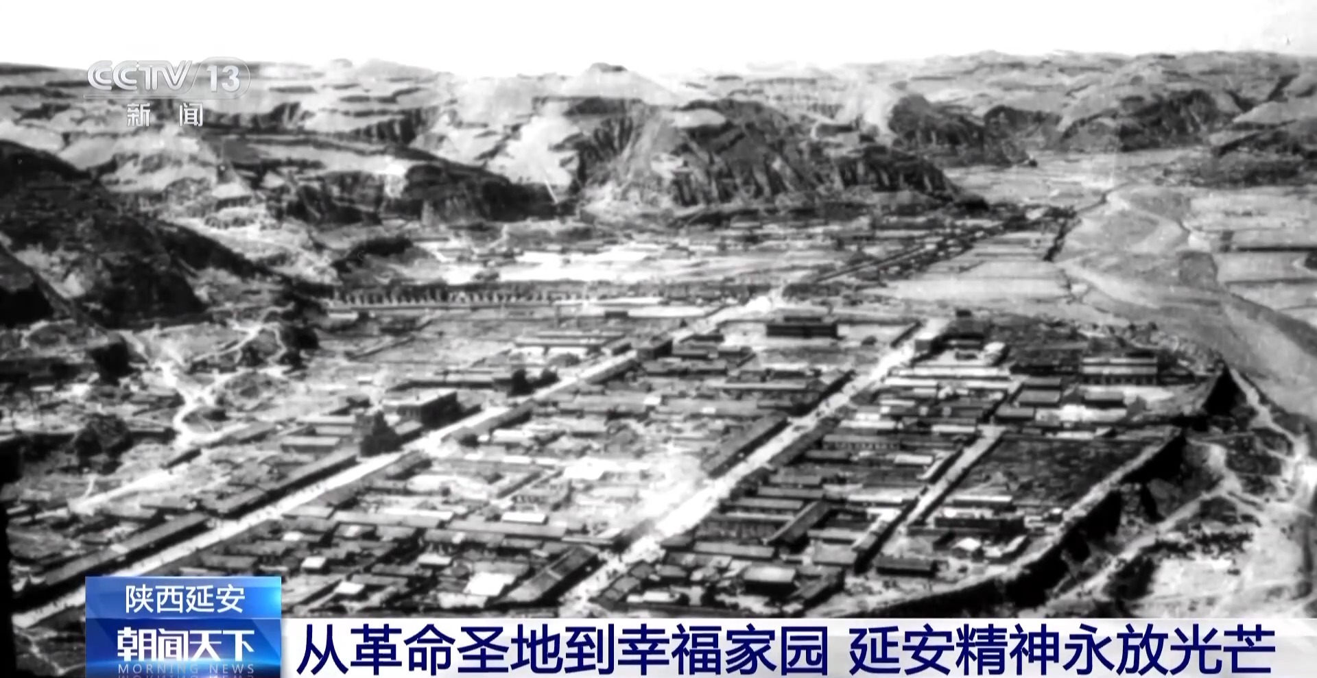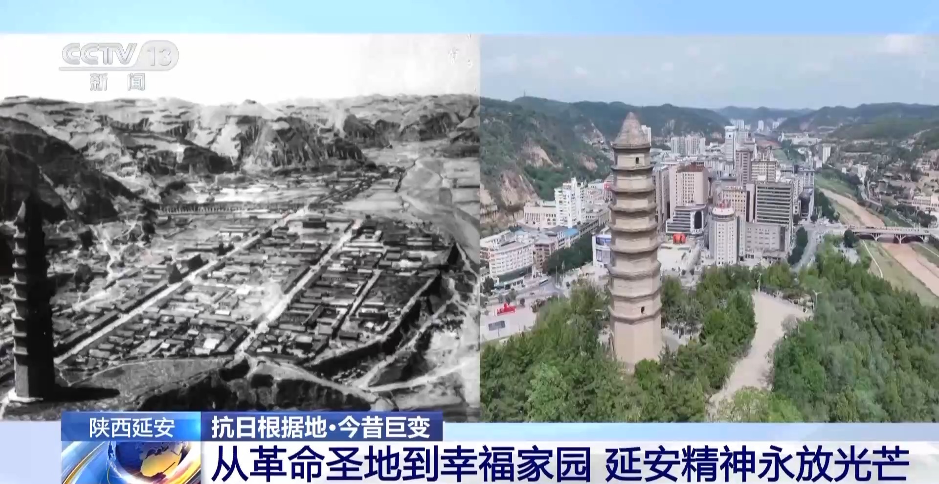 说到延安,很多人自然就会想到巍巍宝塔山,这张照片就是拍摄于80多年前的宝塔山上。当时,城里大多是低矮的平房。如今从同一个位置俯瞰,这里已经发生了翻天覆地的巨变——延河两岸,高楼大厦拔地而起,鳞次栉比的现代化新城矗立眼前。