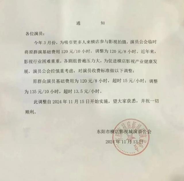 2024 年 11 月,横店演员公会一纸降薪令,将原本 8 小时 120 元,下调为 10 小时 135 元,相当于群演时薪从 15 元下降到了 13.5 元。