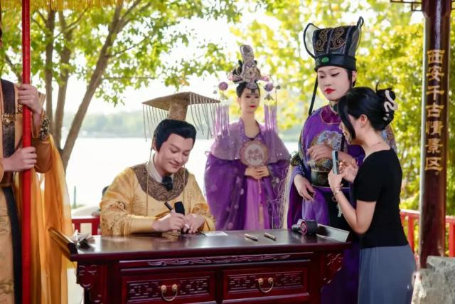 在西安,"李世民"骑着摩托车载着"秦始皇",若去的巧,甚至能见到"三皇共舞"大场面。游客喊一声"参加皇上",他立刻"封官加爵":男的封将军,女的封郡主。玩得开心,还附赠一个身旁的"公公",互动氛围过于热闹。